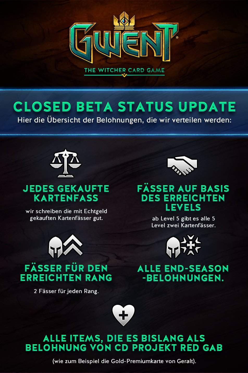 Trotzdem wollen wir euch für die Zeit, die ihr in die Verbesserung von GWENT investiert habt, belohnen. Und deshalb dürft ihr einige Fässer öffnen. Und die Chancen stehen gut, dass ihr eine stabile Anzahl an Fässern von uns bekommt.