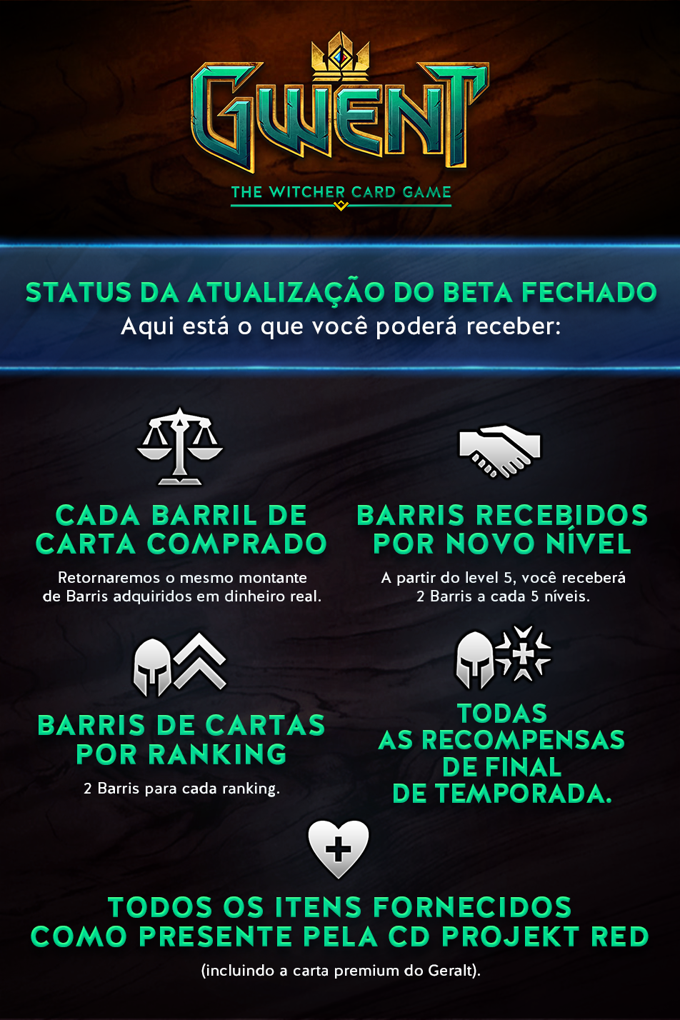 Acreditamos que, depois de tudo ser finalizado, você terá Barris suficientes para criar ótimos baralhos! Mais uma vez, obrigado por jogar GWENT e torná-lo cada vez melhor. Nós realmente apreciamos isso.