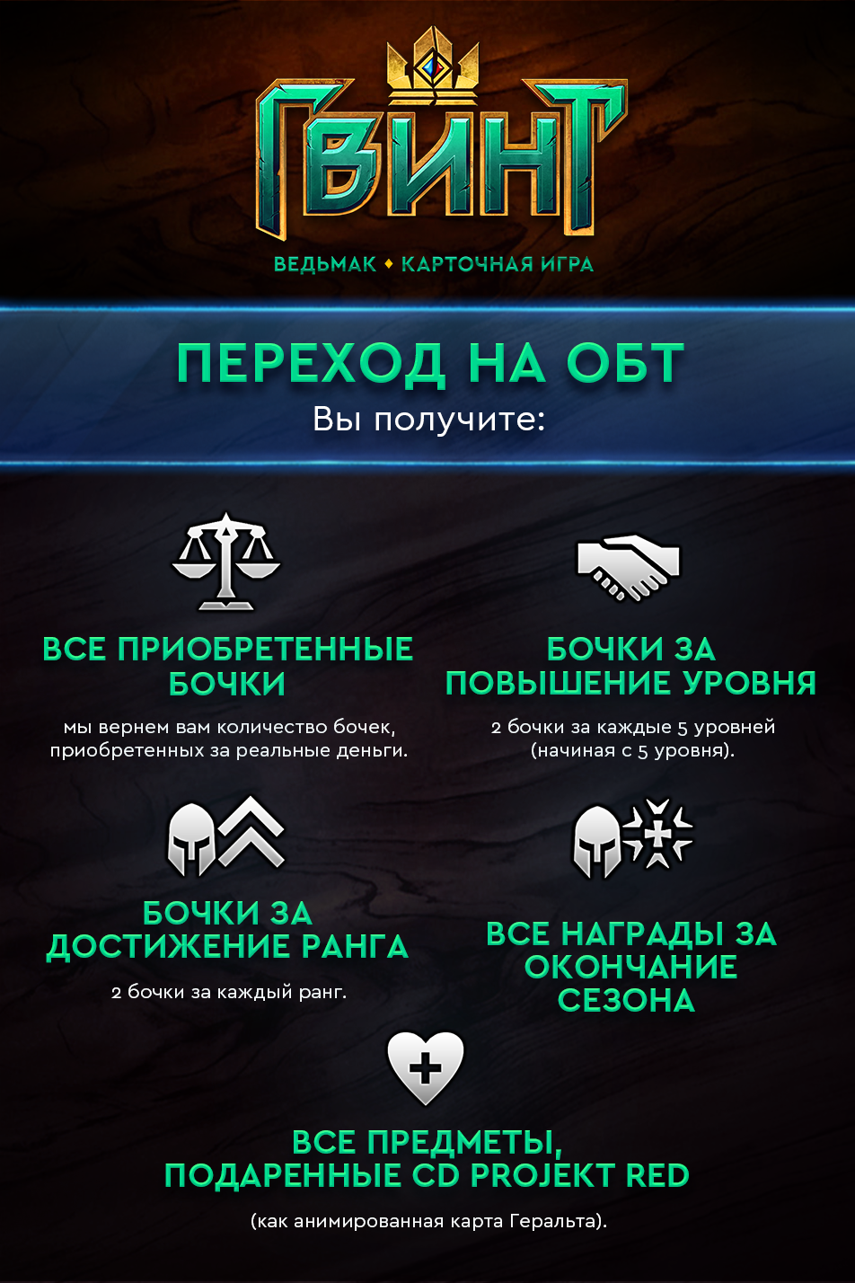 Однако мы также хотим поблагодарить вас за помощь в тестировании ГВИНТА, а это значит, что все участники закрытого бета-тестирования получат новенькие бочки с картами!